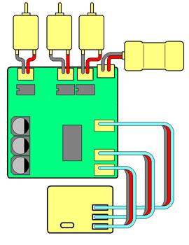 根據喜好將遙控接收機伺服器信號連接至本控制器上的油門(CH2),方向舵(CH1),砲身俯仰(CH3)及砲塔迴旋(CH4)控制信號接頭.